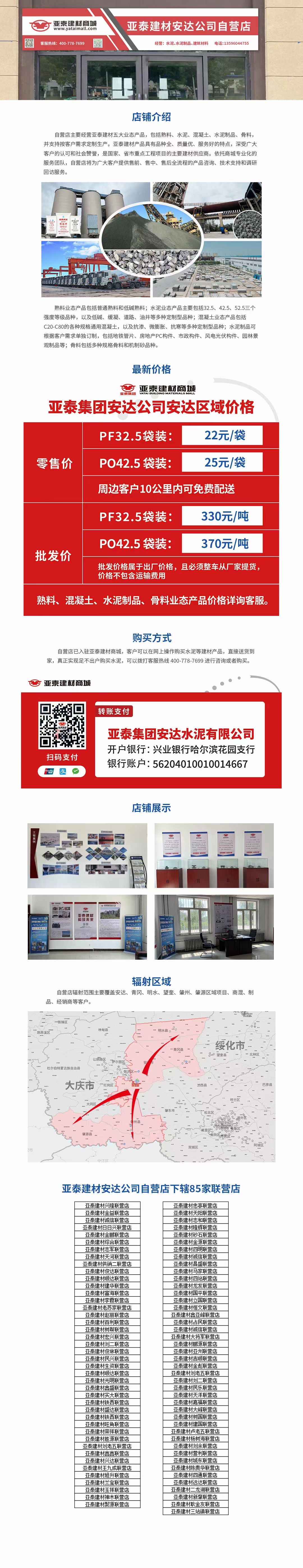 亞泰建材安達(dá)公司自營店主要經(jīng)營亞泰建材五大業(yè)態(tài)產(chǎn)品,包括熟料、水泥、混凝土、水泥制品、骨料,并支持按客戶需求定制生產(chǎn)。亞泰建材產(chǎn)品具有品種全、質(zhì)量優(yōu)、服務(wù)好的特點,深受廣大客戶的認(rèn)可和社會贊譽(yù),是國家、省市重點工程項目的主要建材供應(yīng)商。依托商城專業(yè)化的服務(wù)團(tuán)隊,自營店將為廣大客戶提供售前、售中、售后全流程的產(chǎn)品咨詢、技術(shù)支持和調(diào)研回訪服務(wù),實現(xiàn)客戶掃碼下單,物流配送到家。